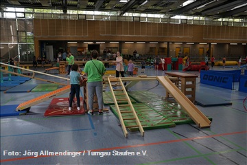 Spaß, Toben und Abenteuer standen am 13.04.2024 bei den STAUFEN Tobe-Tage in Albershausen auf dem Programm. Der TSGV Albershausen und der Turngau Staufen verwandelten vergangenen Samstag die Schulsporthalle in der Schulstraße in einen ganz besonderen In-door-Abenteuerspielplatz. Um die 250 Kinder nutzten trotz der sommerlichen Temperaturen begeistert das Angebot. Die Kinder erwartete in der großen Sporthalle eine abwechslungsreiche Bewegungslandschaft mit über 20 Stationen. Hier war garantiert für jeden etwas dabei. Die Geräteräume der Schulsporthalle wurden komplett ausgeräumt, einige Turngeräte aus der TSGV-Halle in der Schafhofstraße geholt und auch der Inhalt des Turni-Mobils wurde wieder zum Einsatz gebracht. So gab es unzählige Möglichkeiten zum Hüpfen, Rutschen, Balancieren, Klettern, Schwingen, Werfen und Rollen.